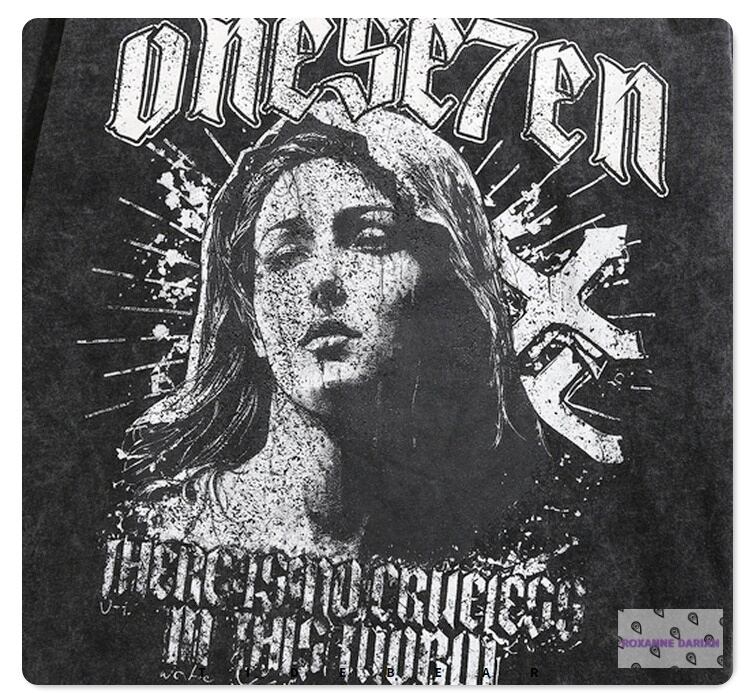 女神モチーフのプリントが印象的で、ウォッシュ加工とダメージ加工によるヴィンテージ感が魅力。