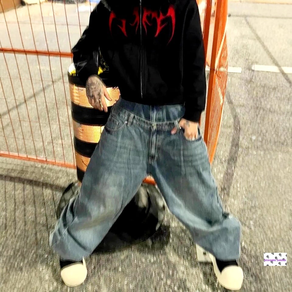 デニムパンツ/ダブルウエスト/ストリート系/ハイウエスト/セクシー/プリントデニム/個性派/アメリカン/Y2K/韓国ファッション/ユニセックス/ゆったり/ロングパンツ/SMLXL