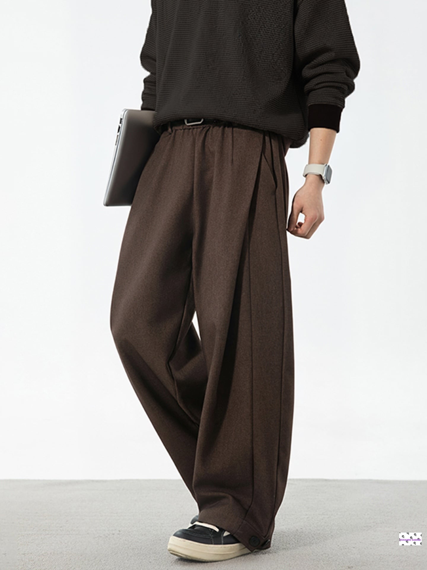 春夏メンズワイドパンツ|スラックス風ゆったりシルエット 無地4色(ブラック・コーヒー・赤茶・ライスグレー)M〜3XL 裾調節可能の万能ボトム