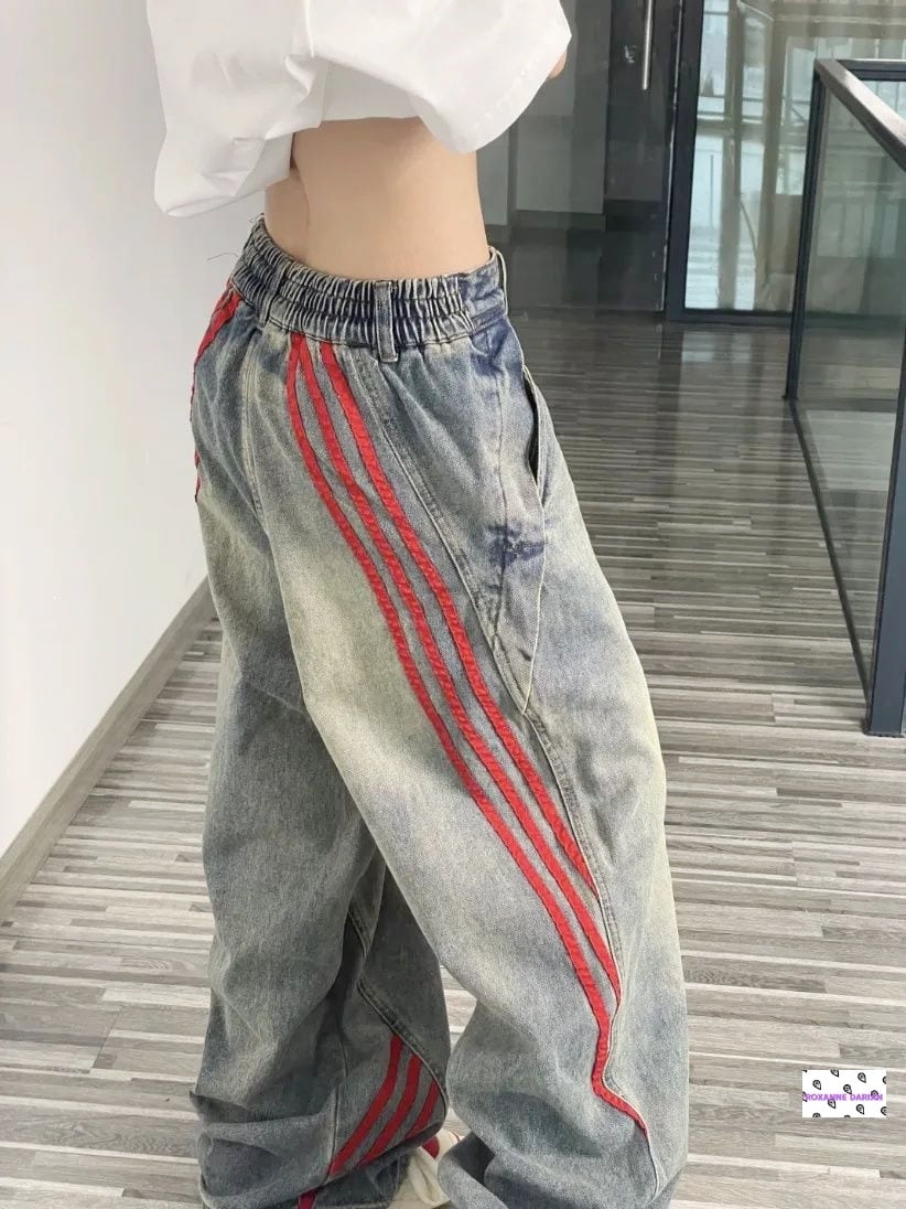 レディースストレートデニム|赤ライン入りレトロワーク風ワイドパンツ ハイウエスト×ルーズシルエット S〜XL 春夏秋対応 ヴィンテージデザイン