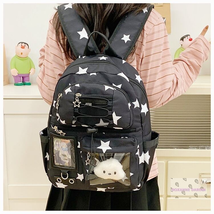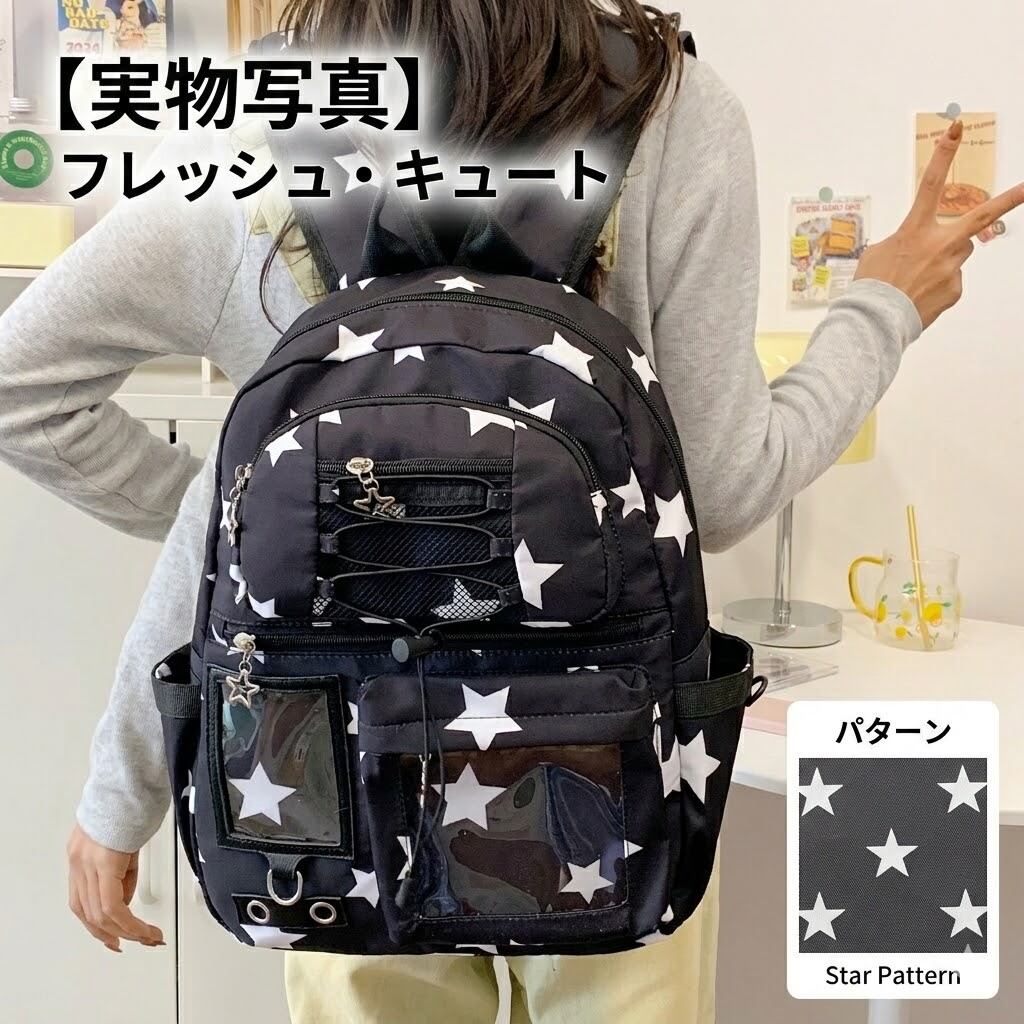 大容量】星柄 バックパック リュック 15インチ対応 20-35L ブラック ポリエステル 中高生 通学 通勤 多機能 キュート ガーリー スイート カジュアル ユニセックス