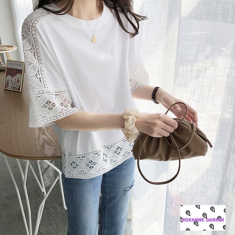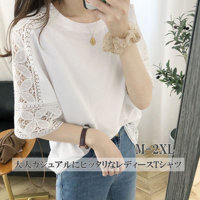 Tシャツ レディース服 トップス 夏 Tシャツ カットソー レディース tシャツ ゆったり トップス 夏 柔らかい 無地 シンプル 五分袖 ラウンドネック レース