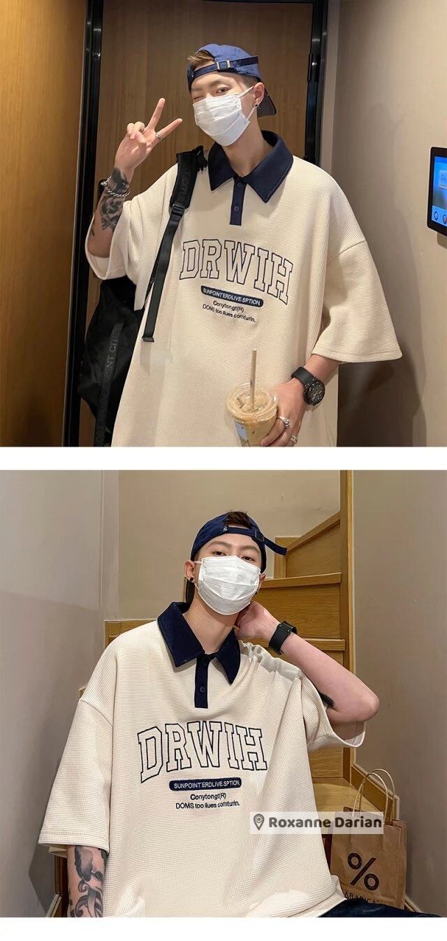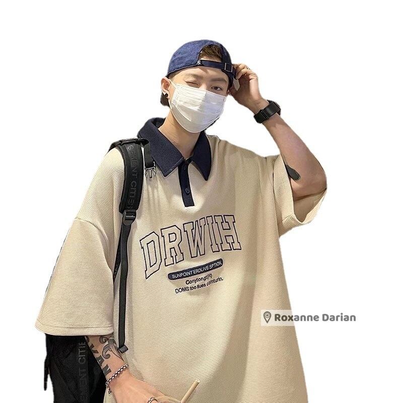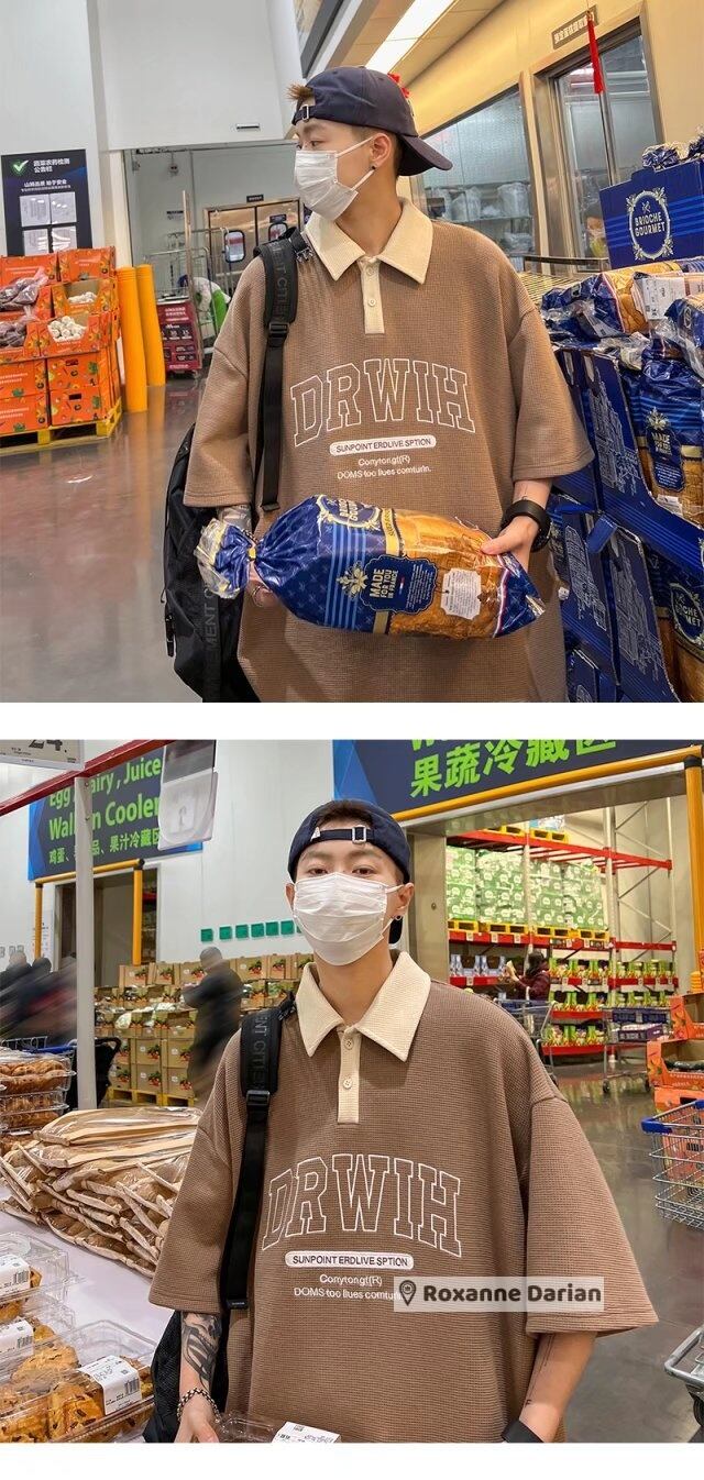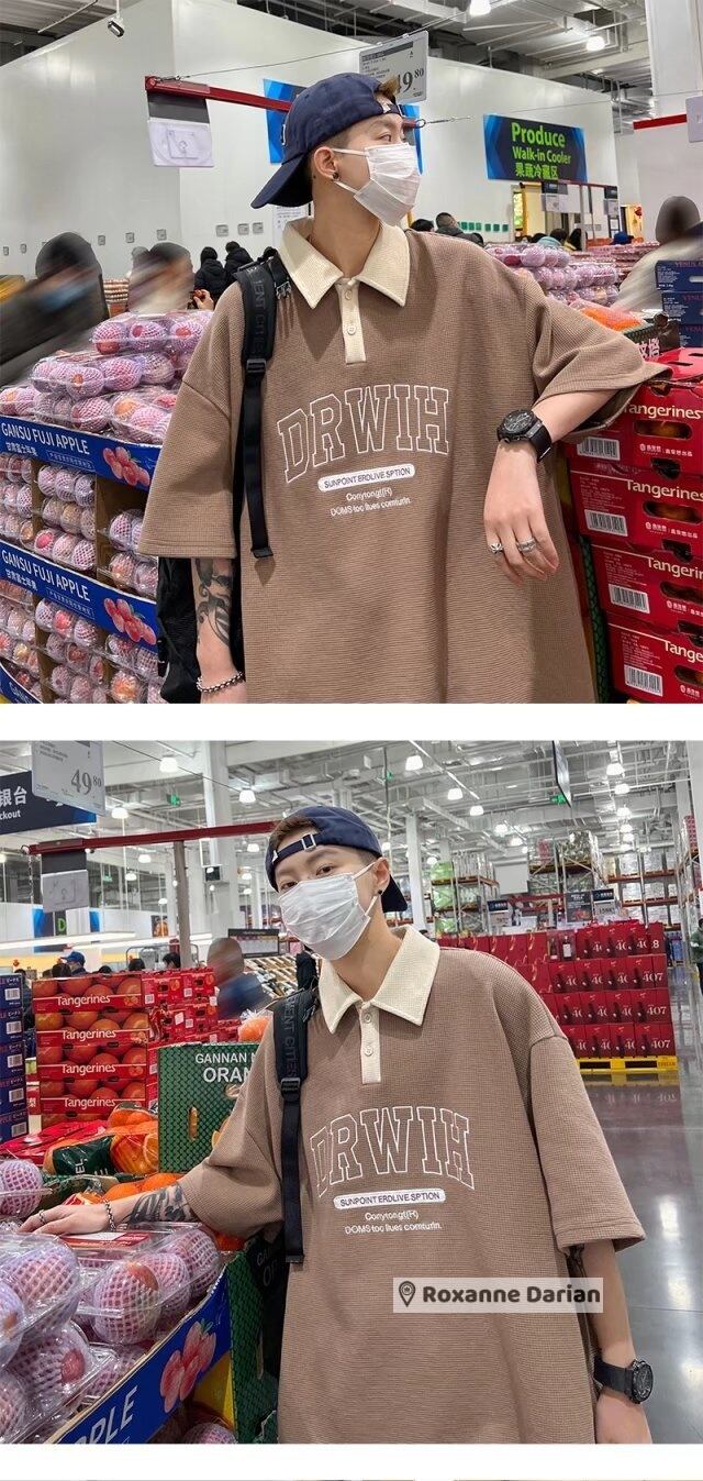 半袖 ポロシャツ ウォッシュ ワッフル Tシャツ しわになりにくい さらさら生地 メンズ ビッグプリント 古着 夏 おしゃれ 襟 M L XL 2XL ネイビー ベージュ ブラウン | RoxanneDarian