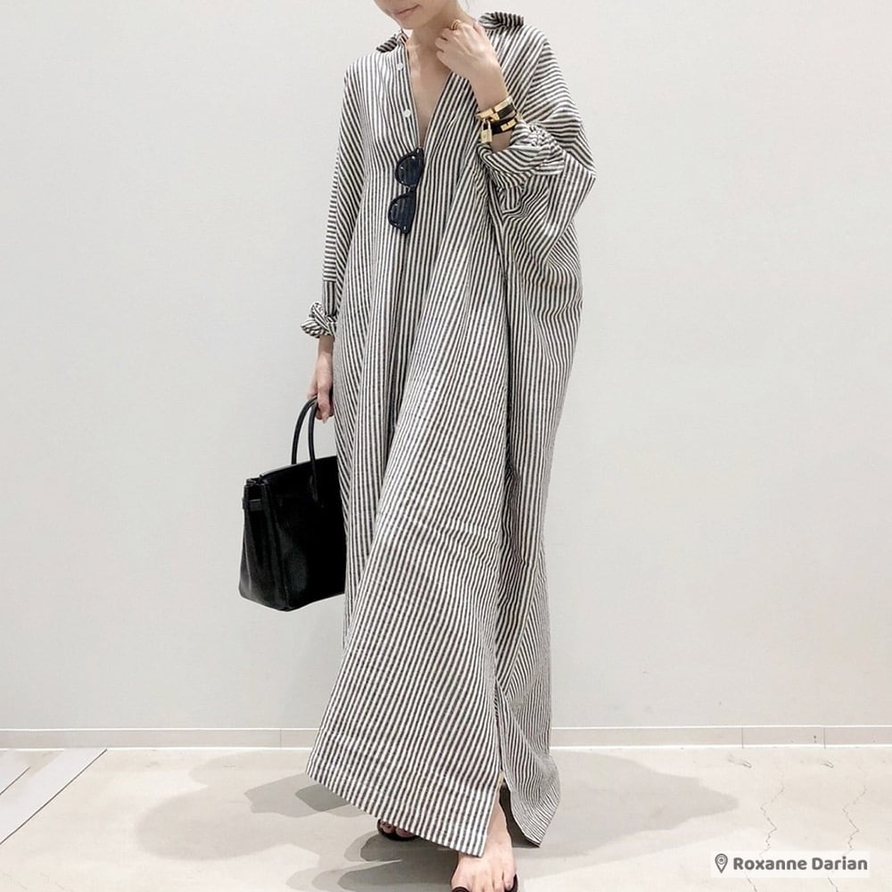 ロング ワンピース ボーダー ストライプ 春夏 シャツ シールス レディース ワンピ 長袖 リラックス 大人 上品 着?せ フェミニン 伸縮性 ストレッチ 高級感 お出かけ お呼ばれ 普段着 シンプル ゆったり 体型カバー | RoxanneDarian