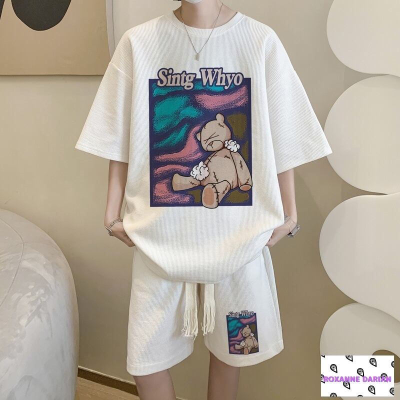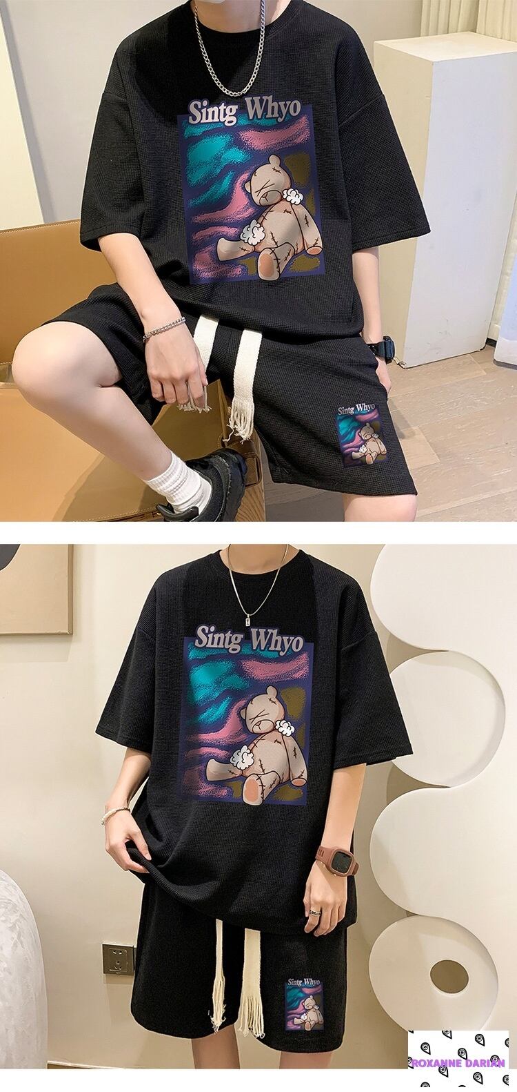 半袖 セットアップ メンズ ヘビー ワッフル パペット ベア カジュアル スポーツ くまさん 短パン メンズカジュアル ワッフル素材 パペットデザイン くまさん短パン 夏用アイテム スポーツウェア ルーズフィット 快適な着心地 アクティブスタイル おしゃれコーデ 普段使い エコ素材 | RoxanneDarian