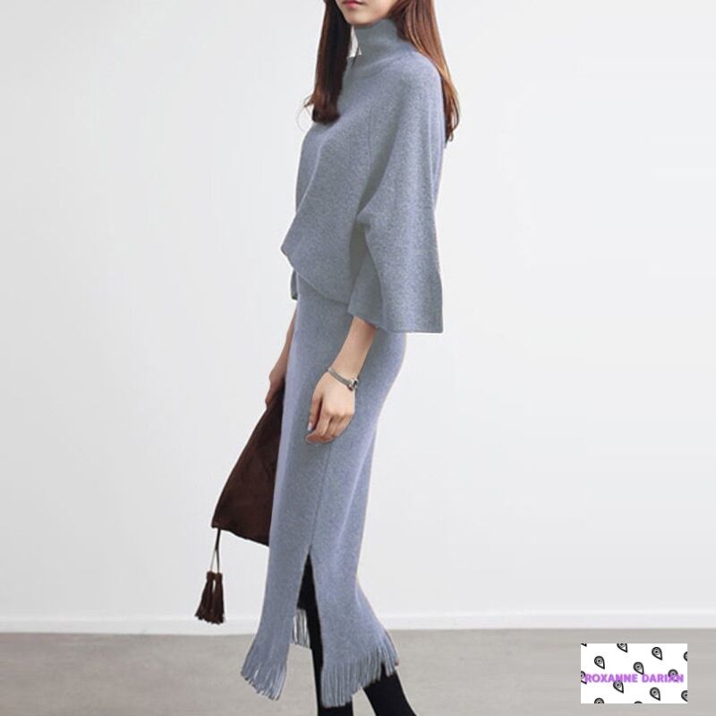 洗練されたデザインのスリット入り2点セットアップ、秋冬シーズン向けのレディーススカートスーツです。上品で大人っぽい雰囲気を演出するロングマキシ丈スカートと、快適な長袖ニットセーターのセット。きれいめスタイルで、通勤やお出かけ、フォーマルなシーンにもぴったり。大人の魅力を引き立てるワンピーススーツです。