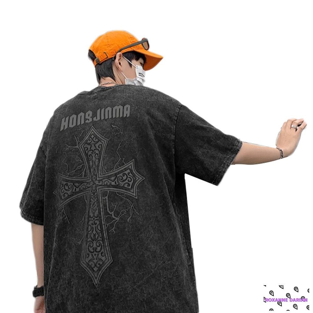 Tシャツ メンズ ウォッシュド デニム バックプリント 十字架 ストリート系 カジュアル ヒップホップ ストリート 大きいサイズ 春夏 ウォッシュドデニム バックプリント 十字架デザイン ストリート系 カジュアルファッション ヒップホップスタイル ルーズフィット 大きいサイズ | RoxanneDarian