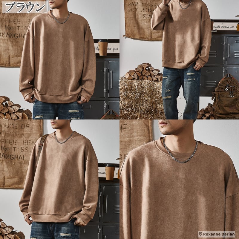 メンズ トレーナー 秋服 スエード ビッグシルエット 無地 大きい サイズ レトロ スウェット プルオーバー ゆったり カジュアル クールネック 冬服 春服 トップス M L XL 2XL 3XL ブラック ブラウン ブルー グレー アプリコット 10オンス 12オンス | RoxanneDarian